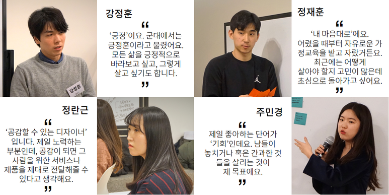 정훈: 전략적 리더십의 실천 수업시간에 강사님께서 ‘같이 놀고 얘기하면서도 그 상황을 관찰할 수 있어야 한다’고 말씀하셨는데 인터뷰를 할 때도 적용해서 전략적으로 접근하면 효과적일 수 있겠다고 생각했어요. 두 수업의 강사님 스타일이 완전히 다르신데 확실히 디자인씽킹 프로젝트와 전략적 리더십의 실천 수업을 병행하는 게 좋은 것 같아요. 냉탕, 온탕 섞으면 효과도 더 좋다고 하잖아요.(웃음)