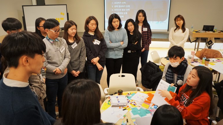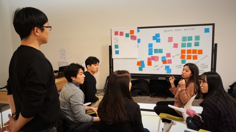 ▲ Design Thinking 수업시간 중 회의하고 있는 A조의 모습
