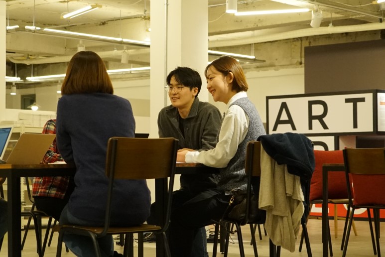 *위누에서 최근 오픈한 '아트업 서울' 공간에서 회의하는 안채윤 님(우)