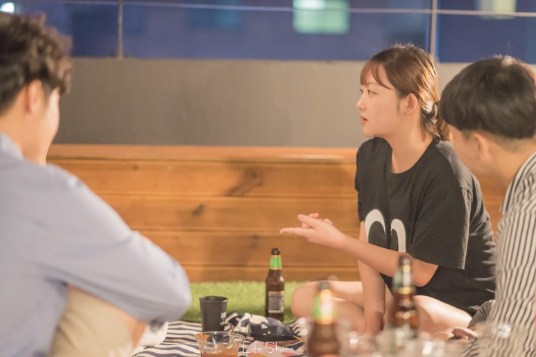 *임팩트 커리어 2기의 입사 전 부트캠프 중 MT가 있었던 연남동 한 카페. 동기들과 이야기 중인 채윤 님.
