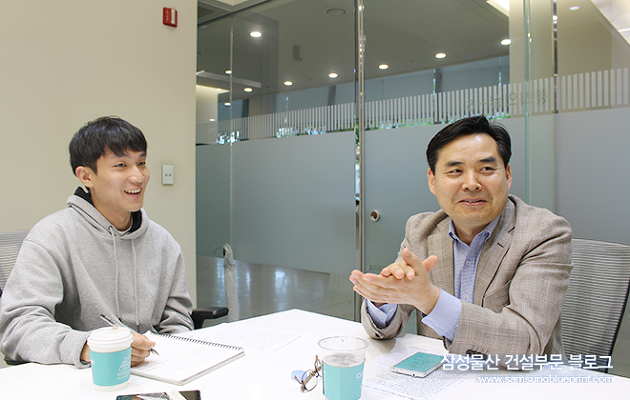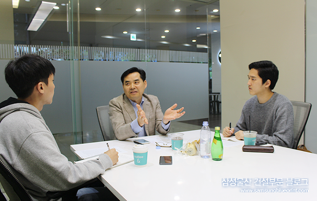 안녕하십니까? 삼성물산 건설부문 대학생기자단 8기 주현우, 조영규 기자입니다. 봄기운이 물씬 풍기는 4월의 어느 날, 특별한 만남을 위해 삼성물산 건설부문에 다녀왔습니다. 바로 삼블리 기자단에서 삼성물산 건설부문의 건축구조 전문가이신 나민수 수석님을 만나기 위해서입니다. 평소 건축구조에 대해 궁금한 것들이 많았던 저희에게 정말 알찬 시간이었습니다. 귀한 시간 내어주신 나민수 수석님의 인터뷰, 지금 들려드리겠습니다!