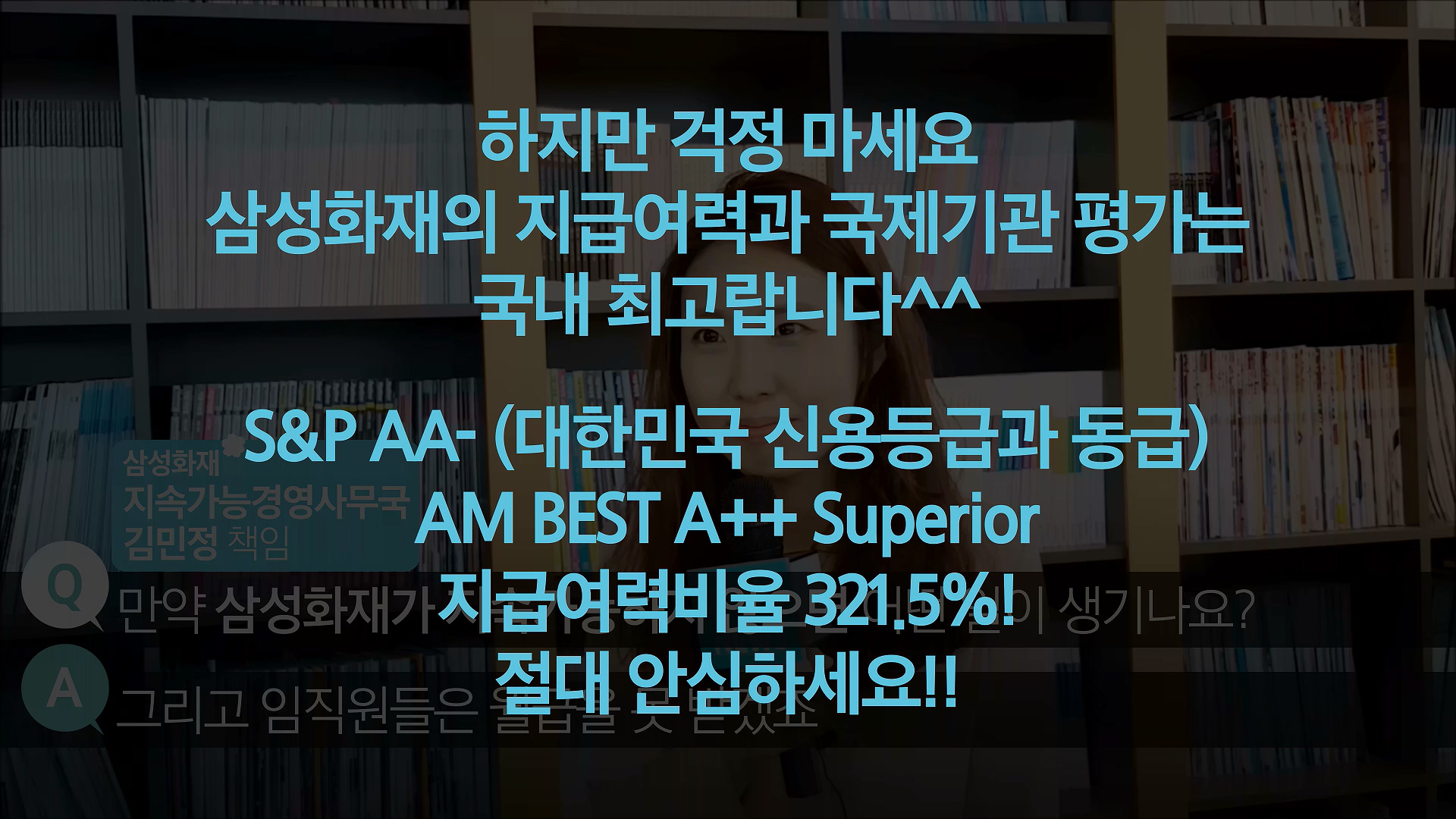 하지만, 위와 같은 상황은 모두 가정일 뿐, 걱정하지 마세요! S&P AA-(대한민국 신용등급과 동급), AM BEST A++ Superior, 지급여력비율 321.5% 등 삼성화재의 지급 여력과 국제기관 평가는 국내 최고랍니다.
