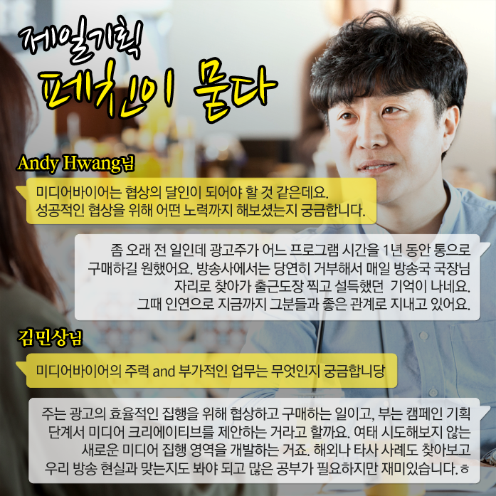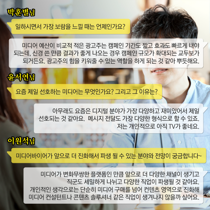 이진영 프로의 인터뷰를 보셨다면 ‘무한도전’ 끝나고 나오는 광고가 예사로 보이지 않으시겠죠?^^ 인터뷰에 앞서 페이스북에서는 미디어바이어 직무에 대한 질문을 공모했는데 답변 들어볼까요?