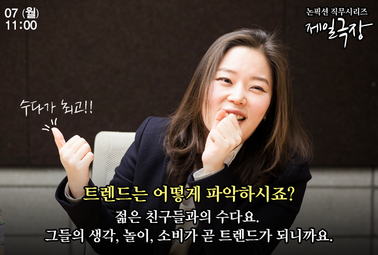 팀장이다 보니 다른 직원들보다 출근 시간이 좀 더 빨라서, 그 시간을 활용해요. 트렌드 리포트나 미디어 리포트, 관련 기사들을 읽으며 제 것으로 만들려고 하죠. 하지만 그런 전문적인 자료들은 거시적인 흐름을 읽기 위한 것이고요, 실질적으로 가장 도움이 되는 건 젊은 친구들이랑 이야기 나누는 거예요. 그들이 생각하고, 말하고, 소비하고, 사용하는 모든 것들이 곧 트렌드가 되니까요. 아이디어를 내거나 발전시키는 데 많은 도움이 된답니다.