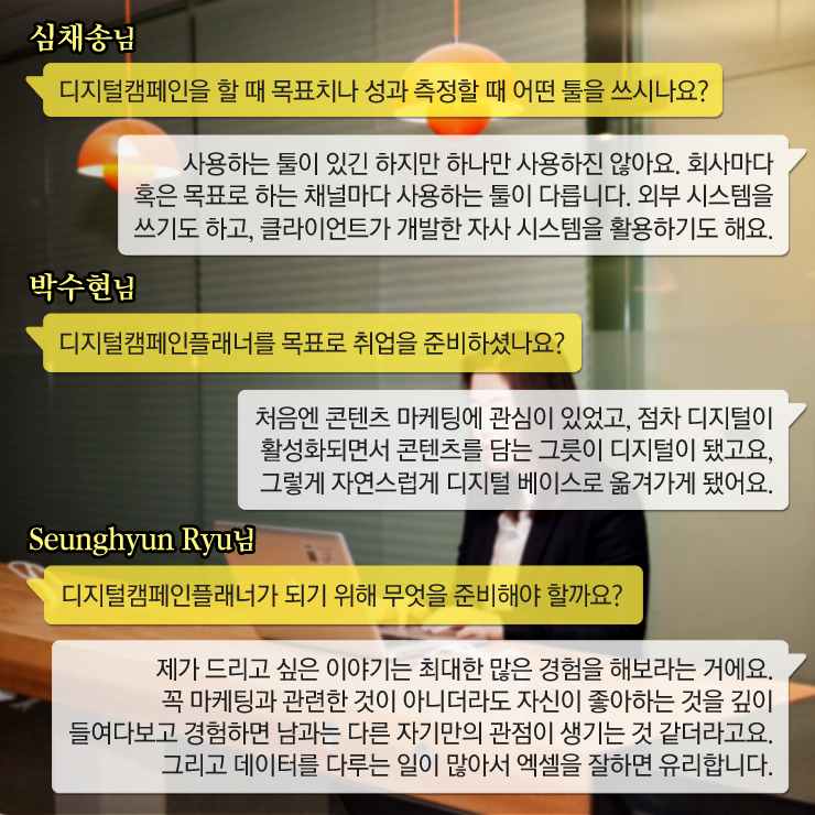 인터뷰에 앞서 제일기획 페친들이 보내준 ‘디지털캠페인플래너’에 대한 질문이 있었죠. 그 답변도 함께 살펴볼까요?
