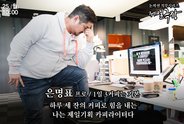 제일기획에서 카피라이터로 근무하고 있는 은명표 프로입니다. 카피라이터가 된지는 14년이 됐고요. 프로덕션과 대행사를 거쳐 제일기획에 입사한지는 8년 정도 됐습니다. 현재 KT, 카스, 삼성물산패션부문 로가디스 등의 광고를 맡고 있습니다. 어느새 우리 팀 카피라이터 중에서 고참이 됐네요.