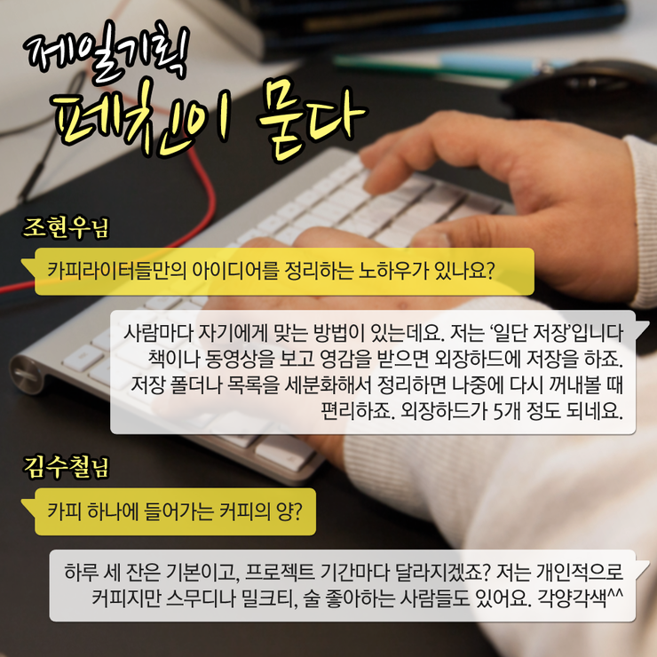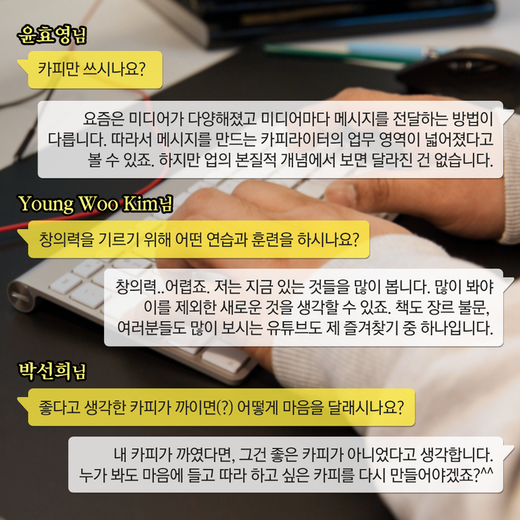 은명표 프로를 만나기 전, 제일기획 페이스북에서는 카피라이터 직무에 대해 궁금한 점을 공모했는데요. 페친들이 남겨준 질문들 중 5개를 선정했습니다. 은명표 프로의 사이다 답변을 들어볼까요?