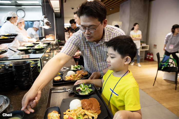 드디어 기다리던 점심시간! 제일 패밀리들은 지하 1층 구내식당에서 가족과 함께 즐거운 식사 시간을 가졌습니다. 메뉴는 어린이들의 입맛에 맞춘 수제 케이준 치킨 커틀릿! 제일 패밀리들은 평소 부모님이 일하며 먹는 밥을 같이 먹으며 소소하지만 특별한 시간을 보냈습니다.