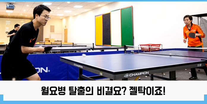 ‘똑딱똑딱’, 매주 월요일과 수요일 저녁만 되면 제일기획 11층에서는 경쾌한 탁구공 소리가 울려 퍼집니다. 젤탁의 정기모임이 열리기 때문인데요. 조용했던 세미나홀에 탁구대만 설치하면 신나게 탁구를 즐길 수 있으니 이만큼 간편한 운동이 또 있을까요?