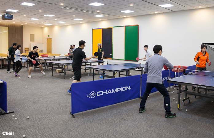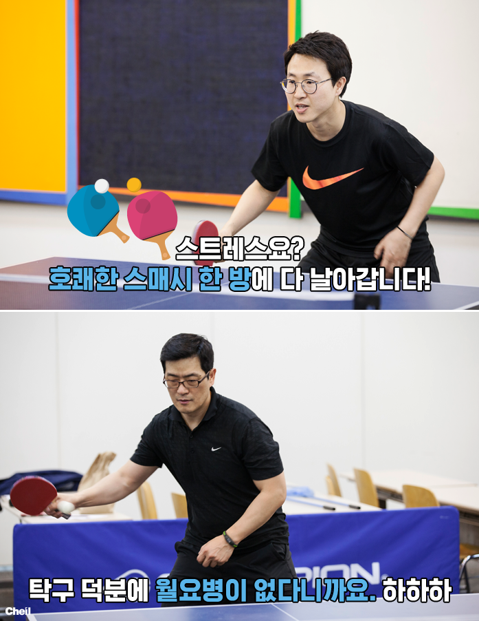 회사를 더 즐겁게 다니는 방법, 아시나요? 제일기획은 직장 동료와 취미를 공유하고 화합할 수 있는 사내 동호회 제도 ‘제일매니아 클럽(Cheil Mania Club)’을 운영 중인데요. 축구, 검도, 야구 같은 운동 에서부터 꽃꽂이, 프라모델, 독서 등등 다양한 클럽이 개성 넘치는 활동을 하고 있습니다. 오늘은 ‘탁구’때문에 회사 생활이 더욱 즐겁다는 제일기획 탁구 동호회 ‘젤탁’의 정기모임에 참여해봤는데요. 연습이 있는 매주 월요일과 수요일이 기다려질 정도로 탁구의 매력에 푹 빠졌다는 이들의 이야기, 한번 들어보실까요?