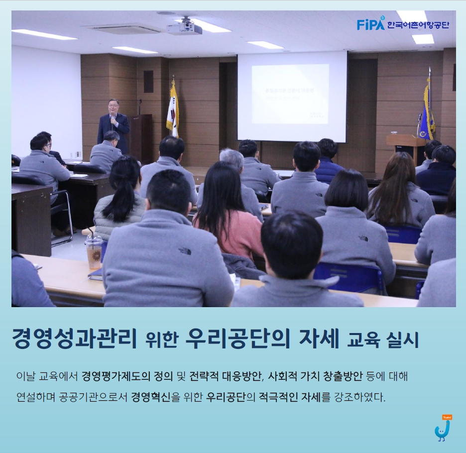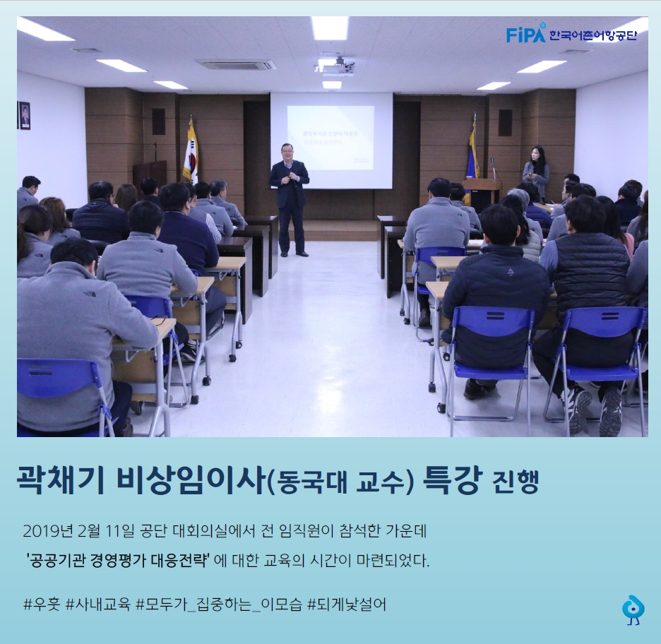 2019년 2월 11일 공단 대회의실에서 전 임직원이 참석한 가운데 '공공기관 경영평가 대응전략'에 대한 교육이 진행되었다. 이날 교육에서는 경영평가제도의 정의 및 전략적 대응방안, 사회적가치 창출방안 등에 대해 연설하며 공공기관으로서 경영혁신을 위한 우리공단의 적극적인 자세를 강조하였다.