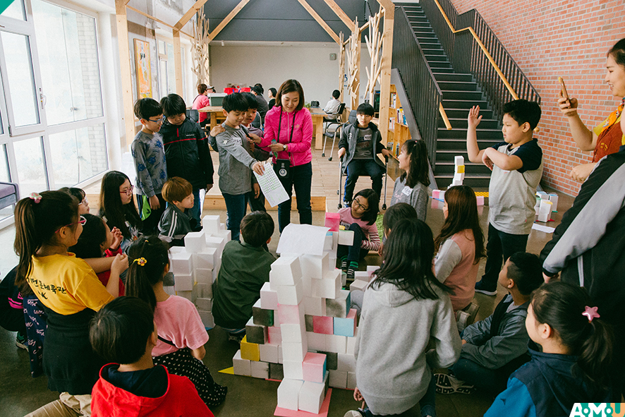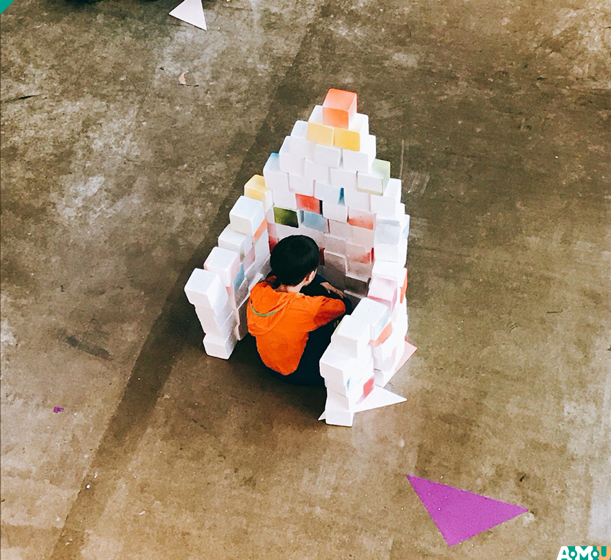 수업과 직접적으로 연관이 있지는 않은데, 그냥 좋았던 것은 아이들이 집중하는 모습이에요. 1학기 수업 같은 경우에는 네모난 블록을 한 사람당 100~200개씩 쓰게 했는데, 네모 블록이 반복되어 쌓이면서 모양이 점점 변해 가요. ‘이 하나가 뭐든지 될 수 있다’, ‘계속 변할 수 있다’, ‘패턴 하나가 모여서 뭐든지 만들 수 있다’라는 아이디어를 담기 위해 가변적으로 탈부착이 가능하도록 했거든요. 아이들이 진짜 집중해서 무언가를 쌓아요. 그런데 제가 따로 시키거나 알려주지도 않았는데 또 쌓고 부숴요. 부시고 또 만들고. 그렇게 집중하는 모습이 인상적이었어요. 약간 본능적인건가? 물론 프로그램 사이사이에 놀이적인 요소가 있기는 하지만, 던져주면 아이들이 알아서 그냥 놀아요. 특정 한 아이가 그렇다기보다는 전체 아이들의 모습이 그래요.
