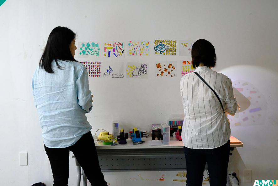 아이들의 패턴이 그려진 투명한 필름을 물건에 대고 비춰보고 하는 것은, 패턴 디자이너들이 패턴 하나를 만들어놓고 컴퓨터상에서 여러 물건에 입혀보는 원리를 가져온 것이에요. 이후 수업엔 이 패턴 위에 또 다른 패턴이 올려지는 ‘레이어’라는 개념을 넣어볼 계획입니다. 색깔이 입혀지고 그 위에 무늬가 올라가고. 보통 패턴 디자인할 때 분판이라는 것을 해요. 겹쳐졌을 때 색깔 변화가 나타날 수 있게 투명 필름 몇 개를 합쳐서 하는 것도 재밌을 것도 같아요.