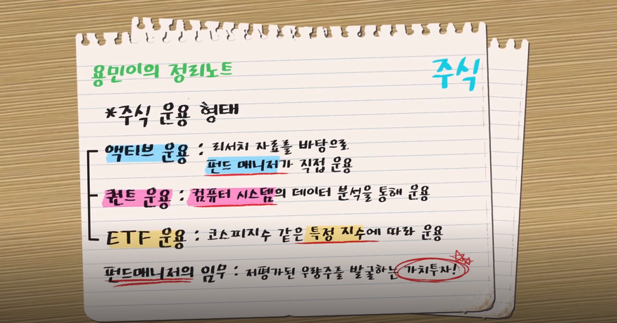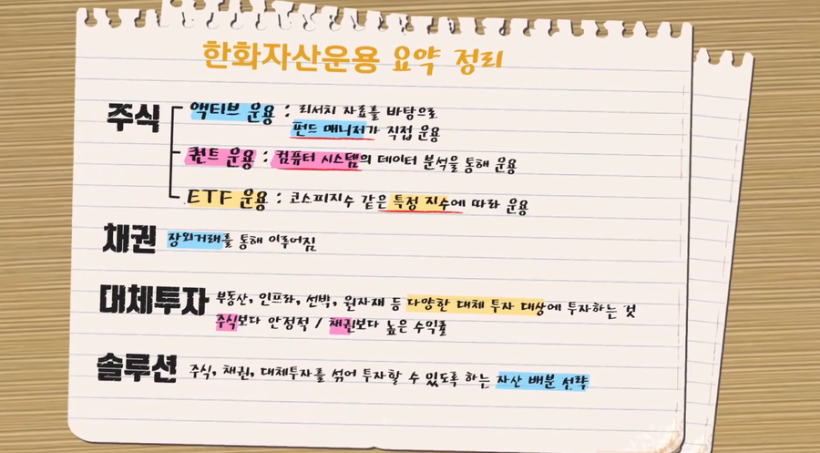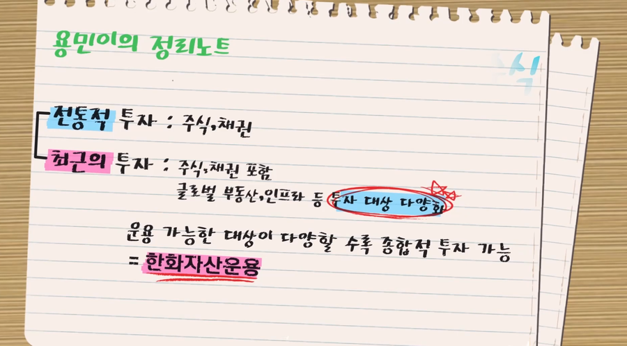 다양한 자산에 투자하는 형태를 운용이라고 하고, 한화자산운용은 이러한 고객의 자산을 잘 운용해주는 역할입니다. 용민이의 정리 노트로 다시 한번 정리해서 볼까요?