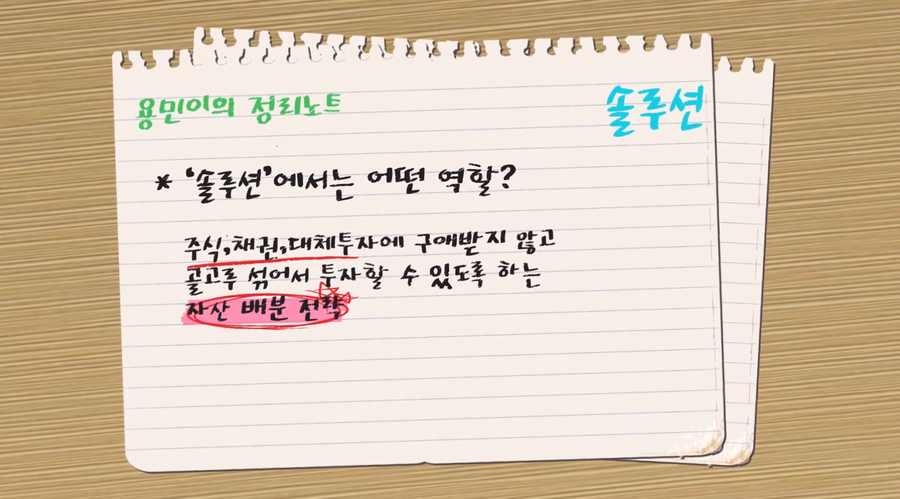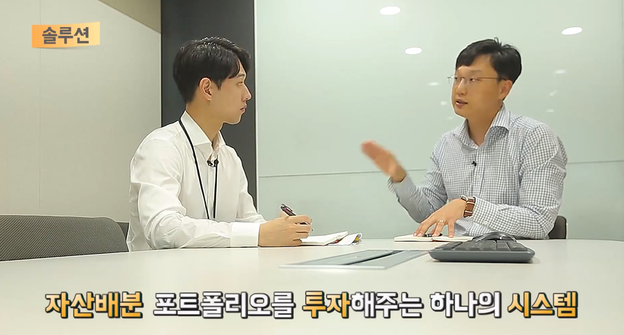마지막으로 솔루션 분야는 어떤 일을 하고 있을까요? 글로벌 자산 배분팀의 최은호 과장이 이 분야를 소개해 주셨습니다. 원래 이 팀의 이름은 솔루션 본부였다고 하는데요. 투자업을 하지 않는 분들에게는 다소 낯선 이름인데요. ‘솔루션’은 주식, 채권, 대체 투자에 구애받지 않고 골고루 섞어서 투자할 수 있도록 하는 ‘자산 배분 전략’을 의미합니다.