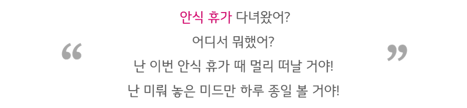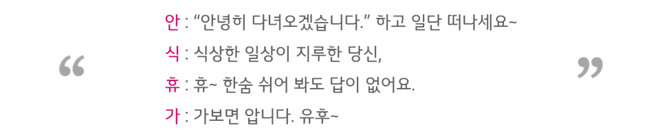 여러분은 안식 휴가 다녀오셨나요? 일상의 긴장을 내려놓고 마음속 깊이 숨겨둔 나만의 ‘To Do list’를 꺼내보세요! 그리고 마지막으로 안식 휴가를 계획하고 계신 분들에게 짧은 4행시로 메시지 하나 전합니다.