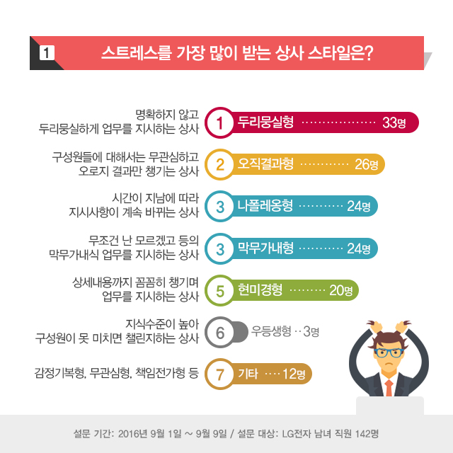 어떤 상사가 스트레스를 주는지 제가 근무하는 부서의 직원들을 대상으로 다음과 같이 설문조사를 한번 해보았습니다.