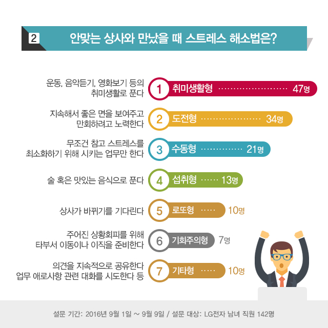 그럼 나와 정말 맞지 않는 상사와 만나 스트레스를 받을 때 직장인들은 어떻게 하는지 알아볼까요?