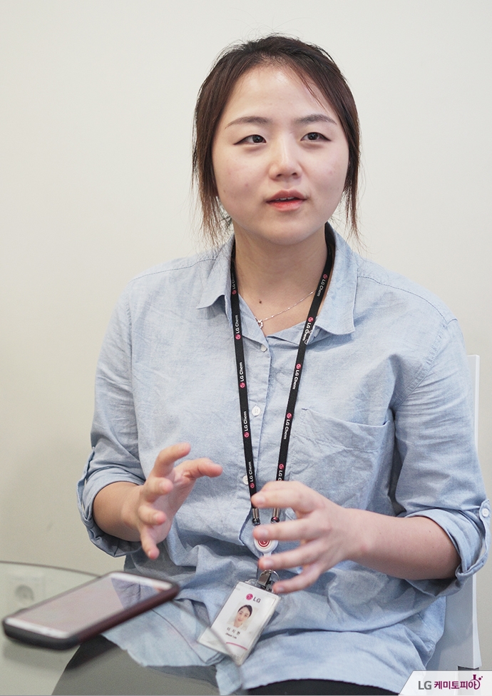 이지현 사원 저는 LG화학이라는 회사 자체를 공부하면 공부할수록 매력적이라는 생각이 많이 들었어요. 사실 제 전공이 화학 쪽은 아니라서 고민도 했는데 ‘결국 전공은 다 이어지는 분야지, 뭐’라는 생각으로 용기있게 지원했어요.(웃음) 사실 TS&D 직군에 지원할 때는 정확히 어떤 일을 하는 곳인지는 알지 못했지만, 정적인 면과 활동적인 면을 다 갖고 있는 제 성격과 잘맞겠다고 생각했고요.