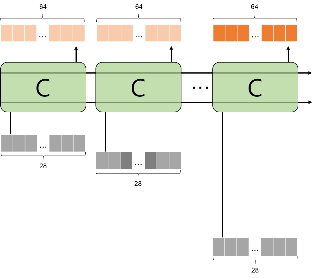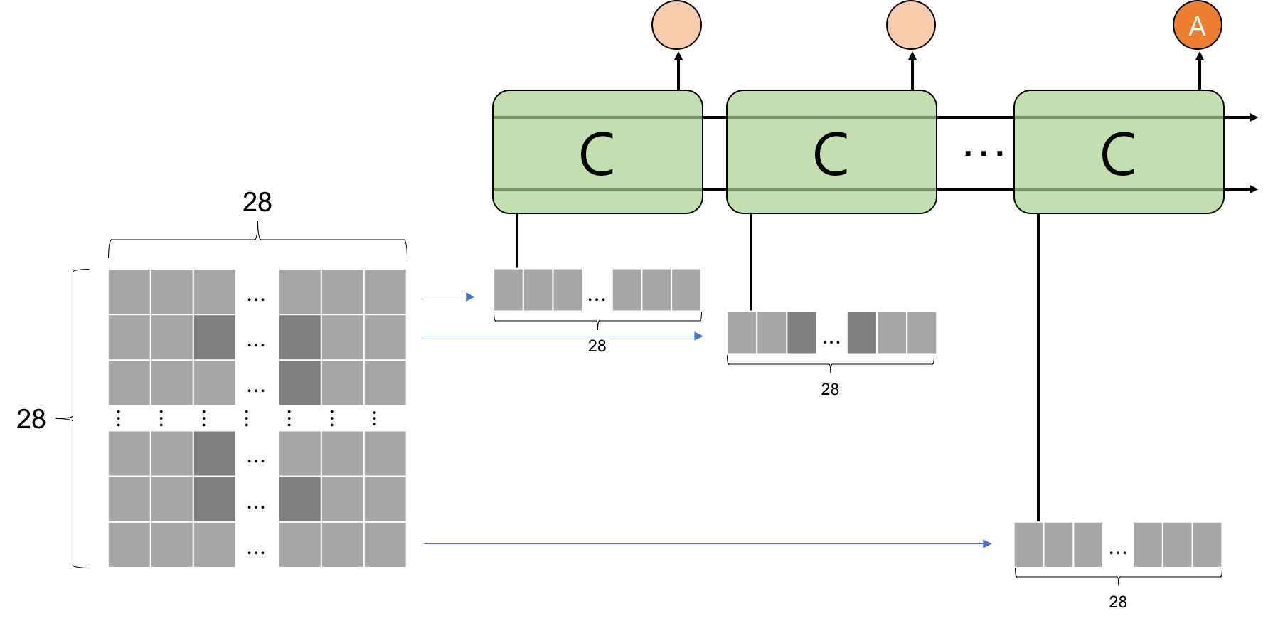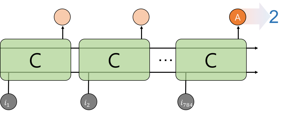 784개의 입력값을 사이즈가 28인 벡터가 28번 이어지는 시퀀스(time step)로 보고, input의 크기를 28, 시퀀스 길이를 28로 각각 설정합니다. 28개의 input은 C라고 표현되어 있는 LSTM 셀로 순차적으로 들어가게 됩니다.