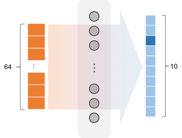 1층의 fully connected layer를 이용하여 64차원 벡터를 10차원으로 줄이고 softmax를 이용하여 0부터 9까지 중 하나의 값을 예측합니다.