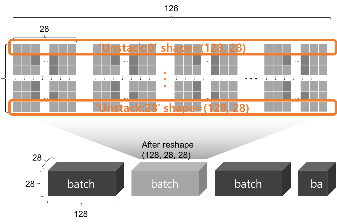 실제 학습이 진행되는 순서로 보자면, batch size만큼 불러온 인풋 데이터는 (128, 784)에서 (128, 28, 28) 형식의 3차원 벡터로 reshape해 줍니다. 그리고 다시 unstack을 통해 time step을 기준으로(axis=1) 28개의 텐서를 만듭니다. 다시말해, (128, 28, 28)이라는 3차원 형식의 벡터는 (128, 28)이라는 2차원 벡터 28개로 변환되어 모델에 입력되게 됩니다. 이런 변환이 필요한 이유는 28*28의 크기를 가진input들을 차례로 넣게 되면 처리속도가 제한적이기 때문입니다. unstack을 이용하면 하나의 batch 안에 있는 input을 한꺼번에 한줄씩 병렬적으로 처리할 수 있게 됩니다.
