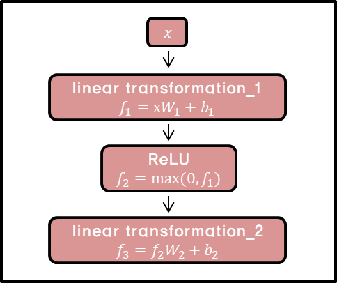 - x<math>x</math>에 linear transformation을 적용한 뒤, ReLU(max(0,z))<math>ReLU(max(0,z))</math>를 거쳐 다시 한번 linear transformation을 적용합니다.