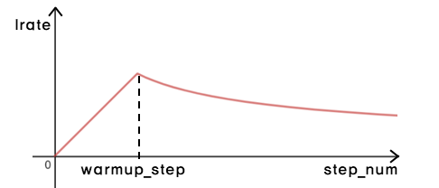 - warmup_step<math>warmup_step</math>까지는 linear하게 learning rate를 증가시키다가, warmup_step<math>warmup_step</math> 이후에는 step_num<math>step_num</math>의 inverse square root에 비례하도록 감소시킵니다.