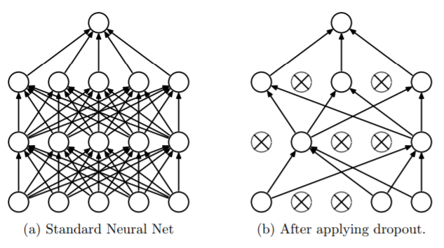 dropout이라는 용어는 neural network에서 unit들을 dropout하는 것을 가리킵니다. 즉, 해당 unit을 network에서 일시적으로 제거하는 것입니다. 그래서 다른 unit과의 모든 connection이 사라지게 됩니다. 어떤 unit을 dropout할지는 random하게 정합니다.