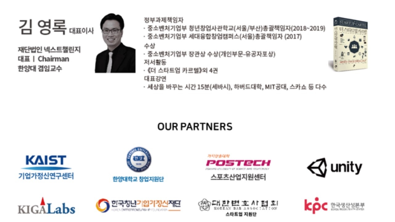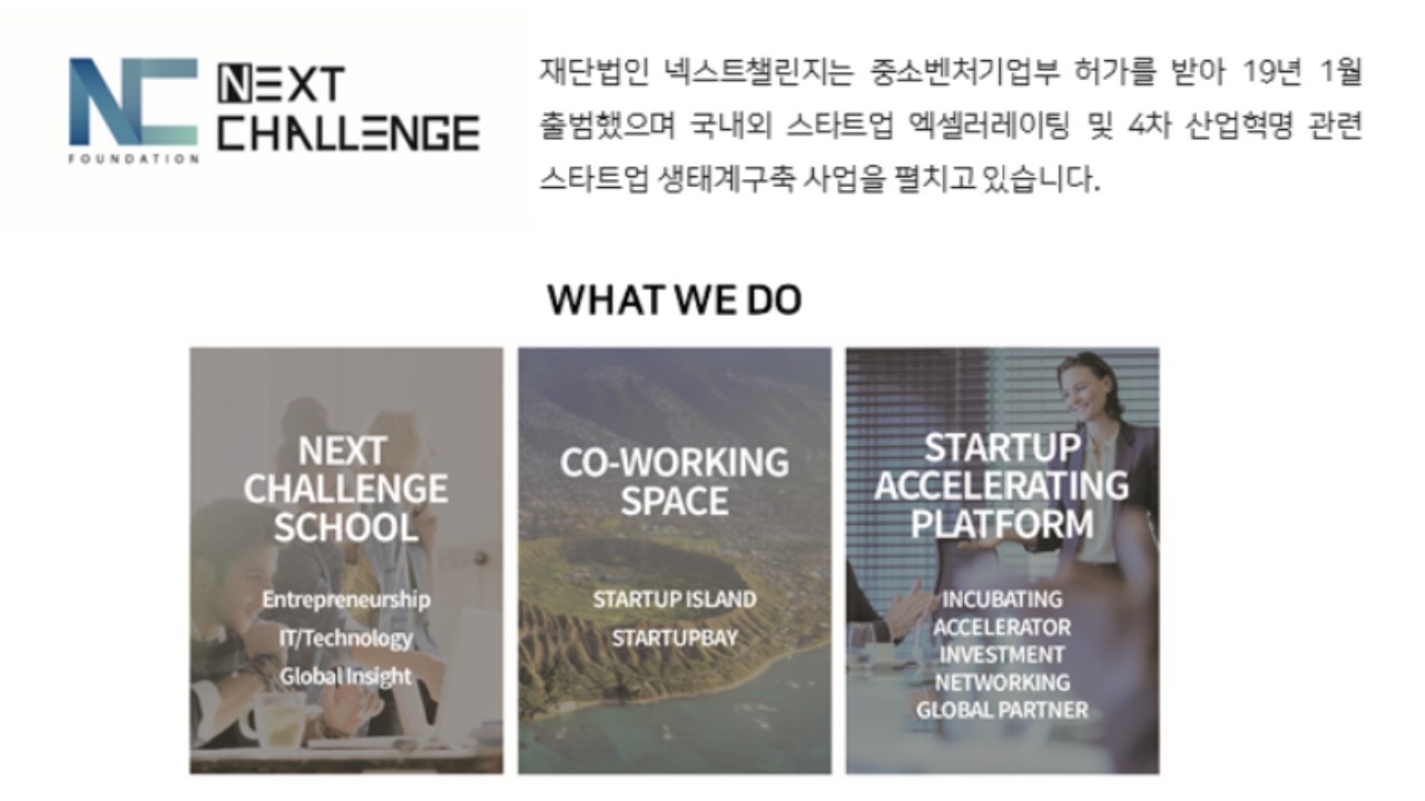 재단법인 넥스트챌린지는 중소벤처기업부 허가를 받아 19년 1월 출범했으며 국내외 스타트업 엑셀러레이팅 및 4차 산업혁명 관련 스타트업 생태계구축 사업을 펼치고 있습니다.