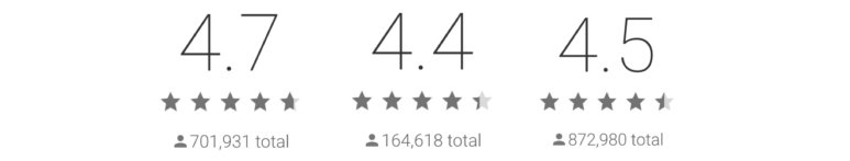 결국, 이러한 기술적 이슈들을 꾸준히 해결하고 있는 알람 앱이 생각만큼 없으며 그 결과 플레이스토어와 앱스토어 모두 상위 알람 앱 중 최고 평점을 기록하고 있다 (아래는 “알람” 검색시 나오는 최상위 3개 알람 앱의 평점 비교).