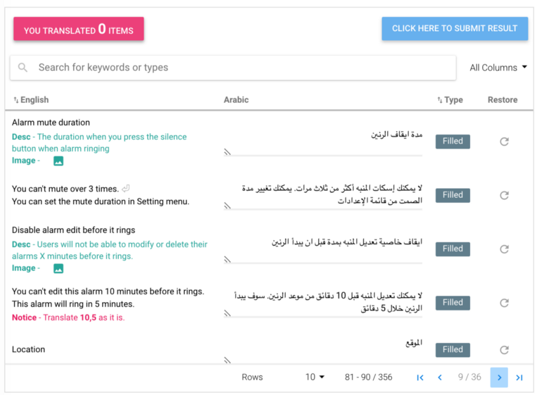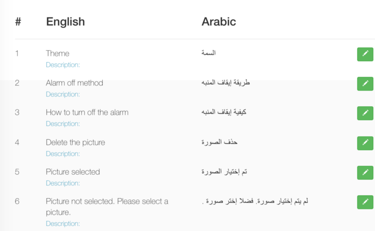 글로벌하게 알라미를 사용하게 만들기 위해 여러 가지 노력을 해오고 있는데, 그 중 한 가지가 바로 로컬라이징이다. 처음에는 번역가를 통한 단순 앱 번역으로 시작했지만, 더욱 자연스러운 번역과 문맥을 사용하기 위해 꾸준히 사용자 참여 번역을 받아오고 있다. 이러한 과정을 효율적으로 하기 위해 내부적으로 Alarmy translation 페이지를 직접 만들어 운영하고 있다. 사용자들이 최대한 편하게 번역에 참여할 수 있도록 꾸준히 개선해오고 있으며, 번역 페이지를 만든 후에 더욱 많은 사용자의 참여를 끌어낼 수 있었다.