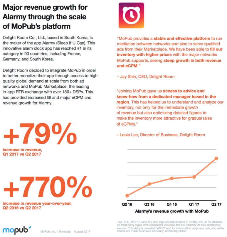 사용자도 꾸준히 늘어 왔기 때문에 정확한 비교가 되진 않지만, 사용자 성장률에 비해 더욱 가파른 수익 성장률을 보이고 있다 (알라미는 Mopub을 primary SSP로 사용하고 있다)
