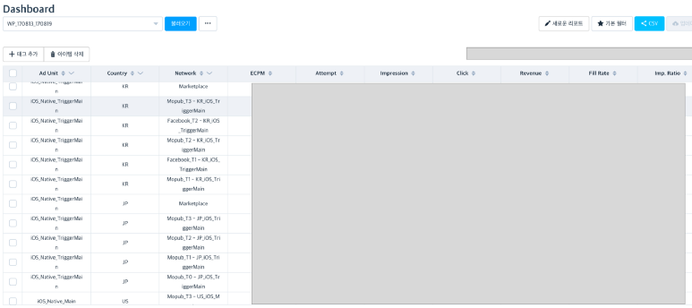사용중인 광고 네트워크들의 성과를 한곳에서 비교하기 위해 만든 내부 툴 (민감한 지표들은 삭제)