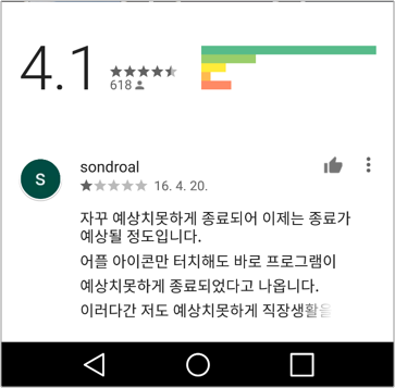 이런 CS 작업들은 사용자의 의견을 파악하는 것 뿐만 아니라 실제로 다운로드에도 영향을 끼칠 수 있다. 예를 들어, 스토어 리뷰의 최상단에 1점짜리 리뷰가 있으면 다운로드에 악영향을 끼치게 되는데, 종종 아래와 같은 경우들이 생긴다.
