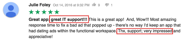 알라미 최상단에 있던 불만 리뷰 예시. 재빠른 대응을 통해 오히려 “Great support” 이라는 긍정적인 리뷰로 바뀜