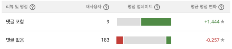 실제로 플레이 콘솔의 알라미 리뷰 데이터를(한 달 어치) 보면 아래와 같이 리뷰에 답글을 달면 1.4점의 별점이 올라가는 반면 답글을 달지 않은 리뷰는 반대로 0.2점의 별점이 떨어지는 것을 볼 수 있다.