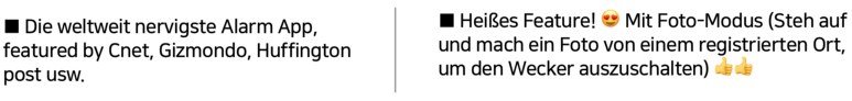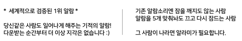 기존의 설명 첫 번째 줄 문구는 Cnet, Gizmodo 등의 유력 외신에서 소개되었다는 문구였는데, 이를 사진으로 알람해제 기능 소개 문구로 변경하였다. ‘자세한 설명’ 부분은 더 보기 버튼을 눌러야 나오는 부분이라 실험 전에는 사실 큰 기대를 하지 않았다. 하지만 결과는 +7.0% ~ +26.6% 였으며, 생각보다 많은 개선이 일어났다.
