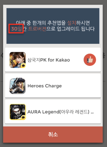 추천앱을 설치하면 30일간 업그레이드 해주는 화면