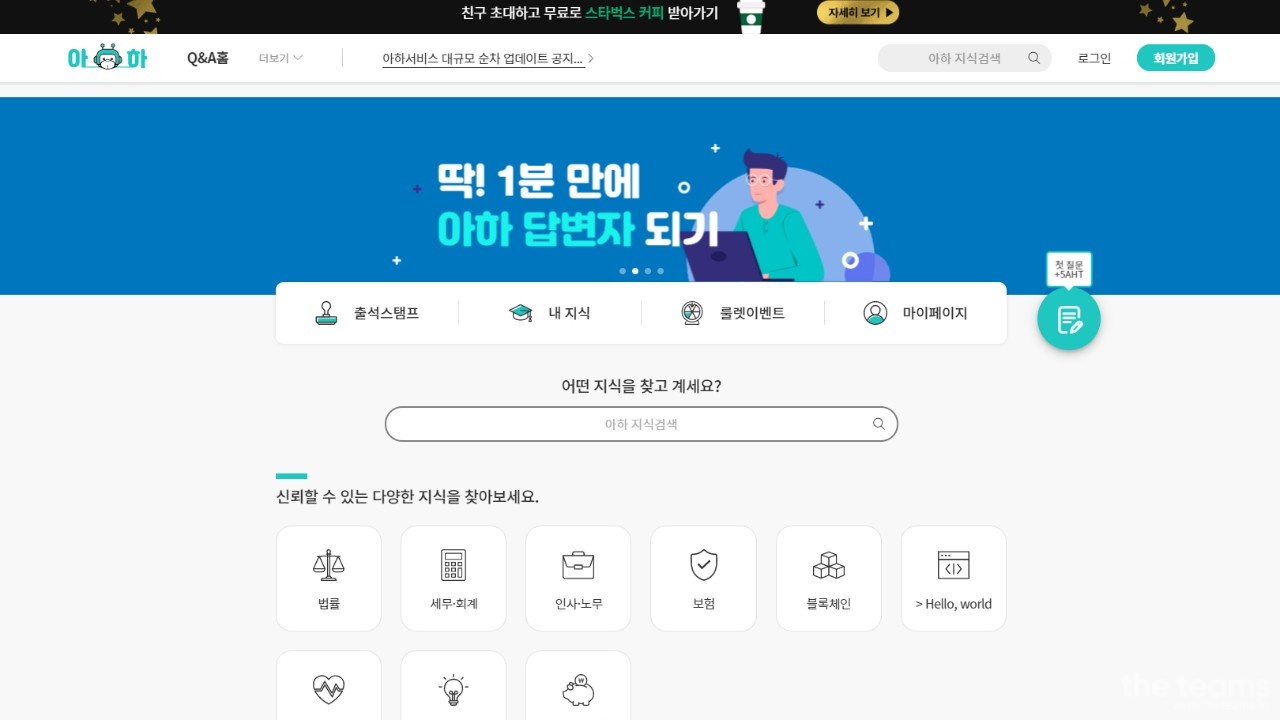 사람들이 궁금증을 해결할 때, 전문가를 찾아야 할 때, 다양한 지식 상품을 구매해야 할 때, 고민 없이 아하로의 입장을 최종 목표로 합니다. 아하는, 사람들의 모든 지식을 담는 공간이 될 것입니다.
