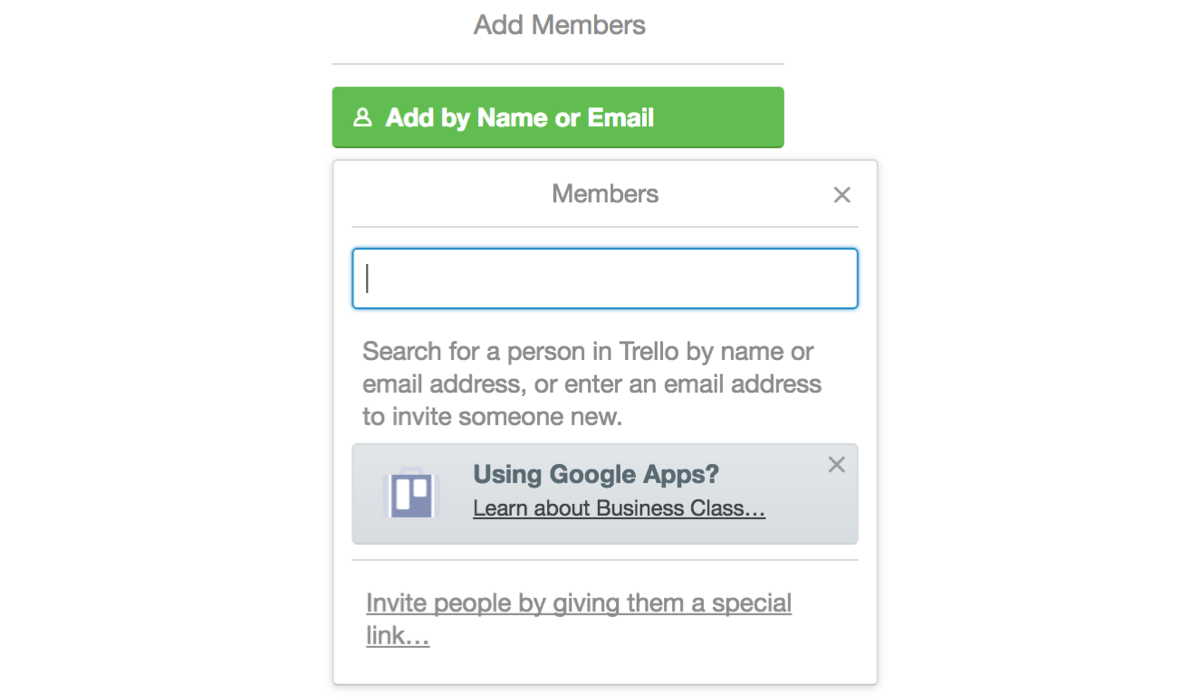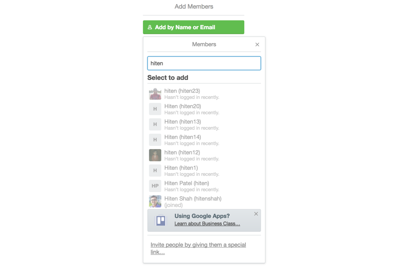 Trello는 유저들로 하여금 이름이나 이메일 주소로 아는 사람들을 등록할 수 있게 만들었다. 유저들은 코드나, ID, 링크 같은 것 없이도 사람들을 쉽게 추가할 수 있다. 심지어 다른 사람들이 Trello를 사용하는지도 알 필요가 없다. 어찌 됐든 Trello를 통해 사람들을 찾아보고 확인해 볼 수 있는 것이다.