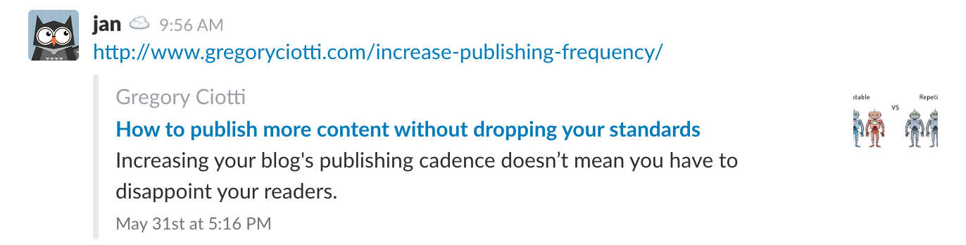 Slack은 메시지 전송에 따르는 불편함을 개선하면서 이용률을 늘려왔다. 그러한 개선의 예를 들어 보자면, 누군가가 Slack에서 링크를 걸었다고 했을 때, Slack은 그 링크에 대한 간단한 정보를 미리 보여준다. 즉, 사람들은 링크를 보려고 앱에서 빠져나와야 될 필요가 없는 것이다. 나중에 다시 그것을 확인해보기도 편하고 말이다.