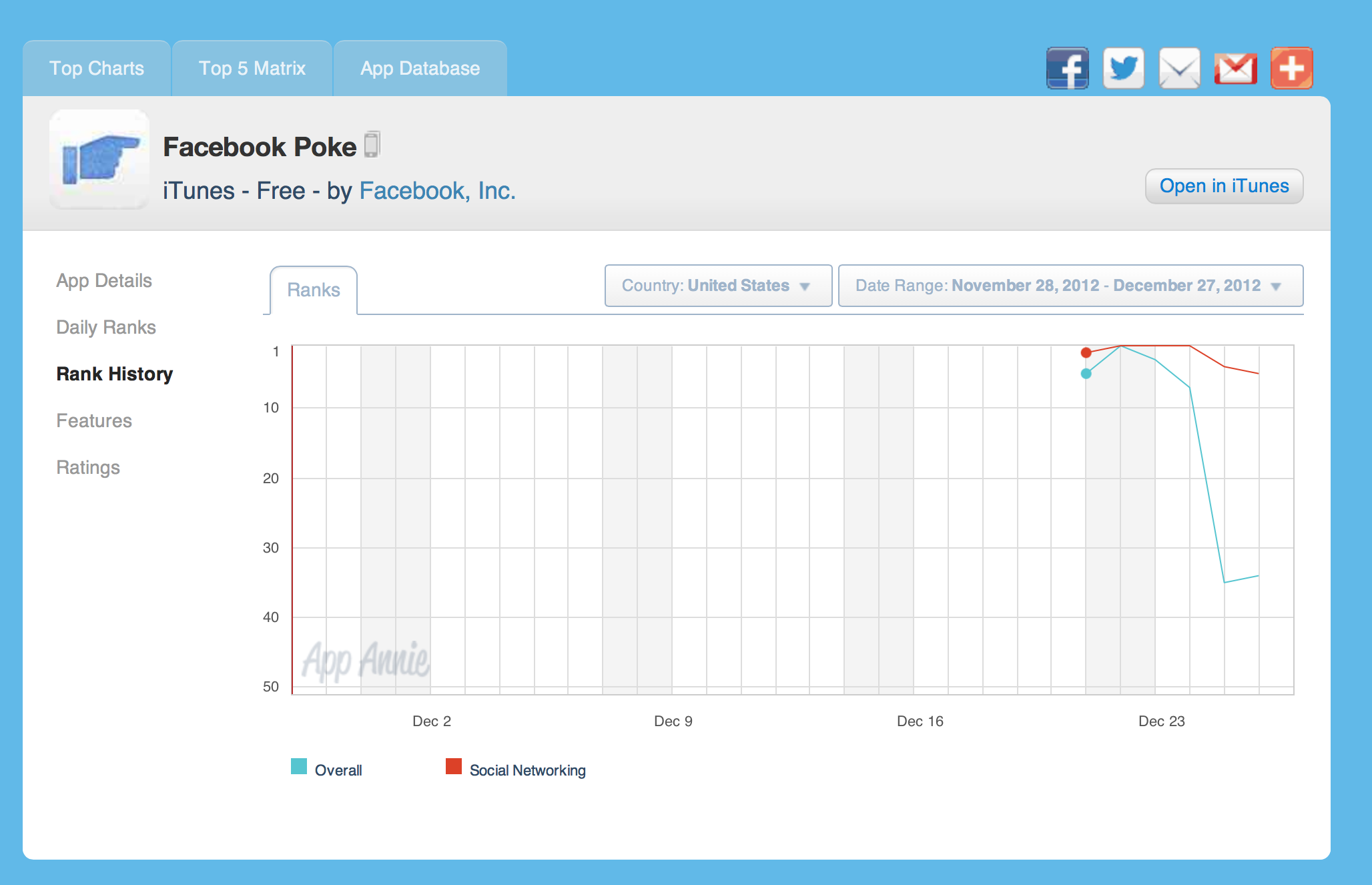페이스북은 스냅챗으로부터 이용자들을 뺏어오기 위해 2012년 별도의 앱인 Poke를 출시한다. 그런데 이 앱은 대실패작이 되었고 페이스북은 얼마 지나지 않아 앱스토어에서 이 앱을 삭제하게 되었다.
