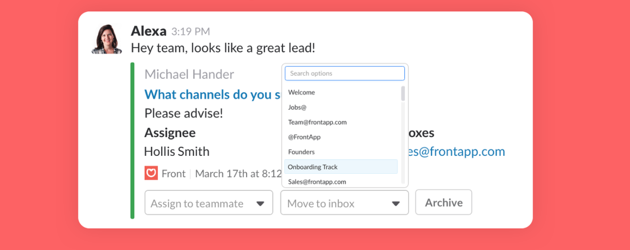 Front와 같은 이메일 클라이언트와의 통합은 사람들로 하여금 Slack에서 바로 이메일을 관리할 수 있게 하였다.