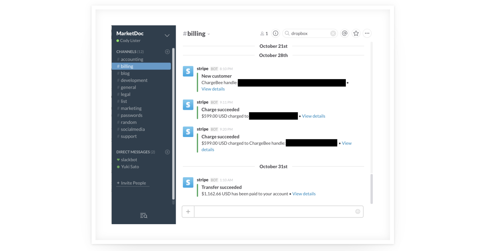 Slack은 또 Stripe와 통합을 하였는데, 이로 인해 사람들은 Slack 내에서 고객 결제 데이터를 보고 관리할 수 있게 되었다.