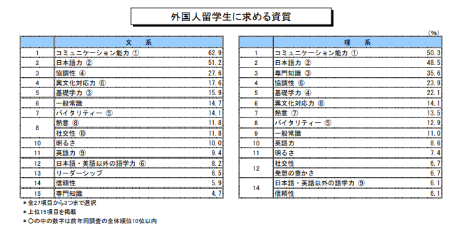 이 표는 '외국인 유학생에게 원하는 자질'이라는 설문의 결과이고, 왼쪽은 인문계열, 오른쪽은 이공계열 인재로 나누어 복수응답을 받아 상위 15개를 표시한 것이다. 다소 차이는 있지만, 양 쪽 모두 압도적인 차이로 '커뮤니케이션능력'을 제1의 조건으로 꼽았고, '일본어 능력'을 그에 버금가는 항목으로 응답했다. 그 외에도 '협조성', '사교성', '일반상식'이 상위 15개 항목에 포함되어 있다.
