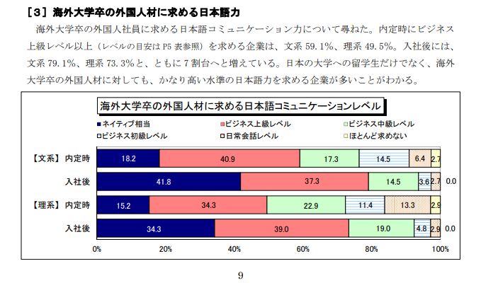이것은 '해외 대학을 졸업한 외국 인재에게 바라는 일본어 능력'을 설문한 것이다. 파란색은 네이티브에 상응하는 수준, 빨간색은 비즈니스 상급, 녹색은 비즈니스 중급, 연파랑 줄무늬는 비즈니스 초급, 옅은 갈색은 일상회화 수준, 노랑색은 거의 요구하지 않는다는 응답이다.
