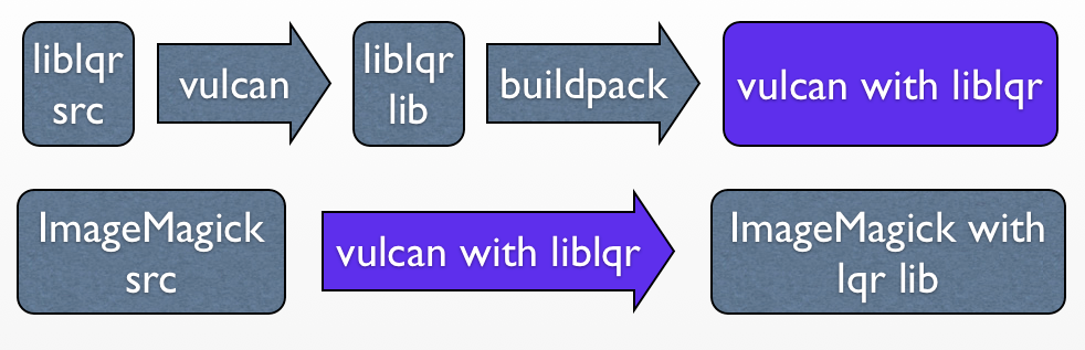 재미있는 점은 Vulcan 서버 역시 Node.js로 작성된 Heroku 앱이기때문에 buildpack을 적용할 수 있습니다. 즉 위와 같은 상황이라면 먼저 liblqr을 빌드한 뒤 이를 Node.js 용 buildpack에 적용해서 Vulcan에 올린 뒤 ImageMagick을 빌드해야 합니다.
