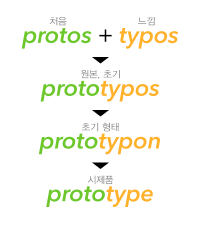 Prototype이란 “처음”을 뜻하는 그리스어 protos와 “느낌”을 뜻하는 typos가 합쳐져 “원본”, “초기”를 뜻하는 prototypos가 되었고, 이것에서 발전한 “초기 형태”인 prototypon에서 유래하였습니다. (출처: 위키피디아)