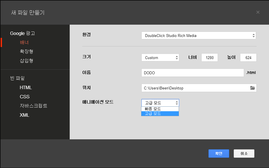 3. 플래시처럼 레이어를 생성해 소스를 하나하나 움직이기 위해서 새 파일에서 배너를 선택, 태블릿 해상도(or 원하는 크기, 저는 태블릿에 들어갈 애니메이션을 만들어야 했기에 태블릿 해상도에 맞췄습니다.) 크기에 맞춰 작업 크기를 설정해 줍니다. 파일의 이름을 지어준 후 애니메이션 모드는 고급 모드로 설정 후 확인을 누릅니다. (빠른모드에서는 레이어 생성을 할 수 없습니다.) * 파일은 html로 저장됩니다.